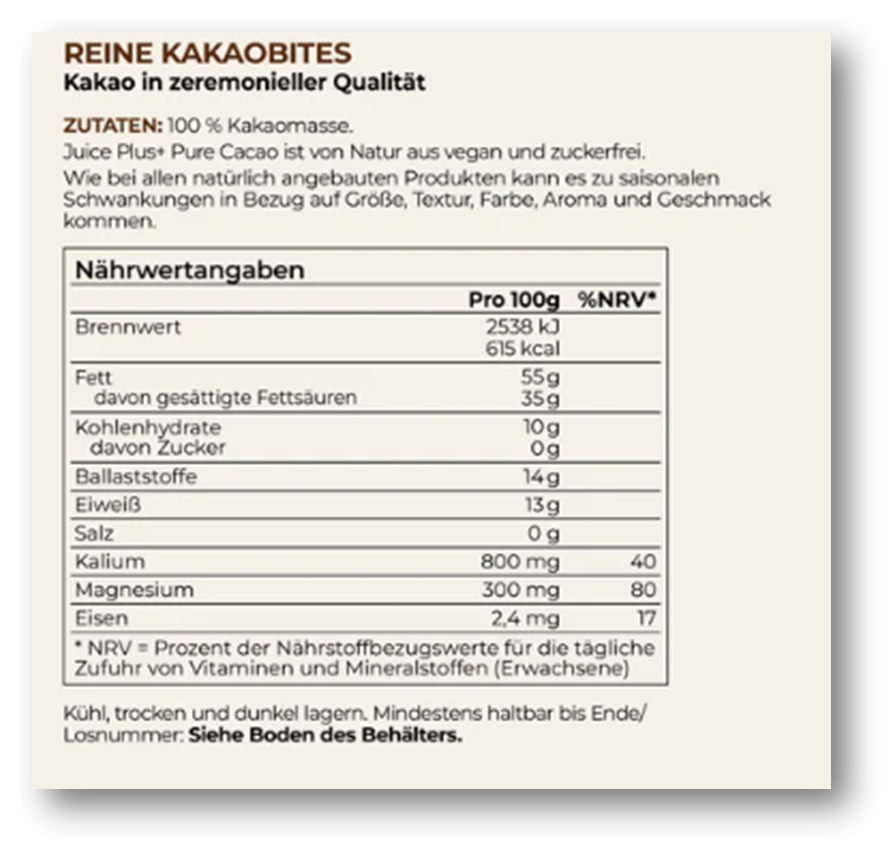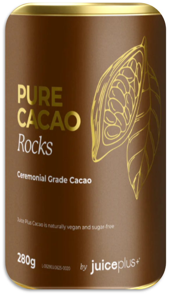Du kannst Juice Plus+ Pure Cacao direkt aus der Dose genießen, zu Studentenfutter hinzufügen oder auf deine Smoothie-Bowls geben!
